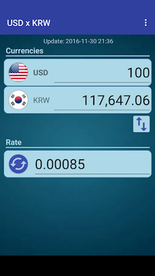 A simple currency converter from United States Dollar to South Korean Won and from South Korean Won to United States Dollar.