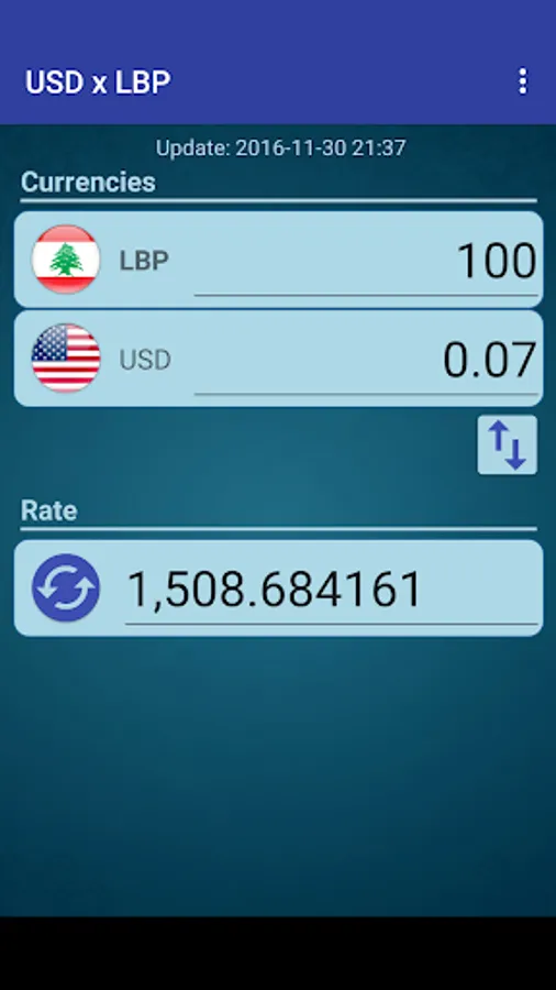 A simple currency converter from United States Dollar to Lebanese Pound and from Lebanese Pound to United States Dollar.