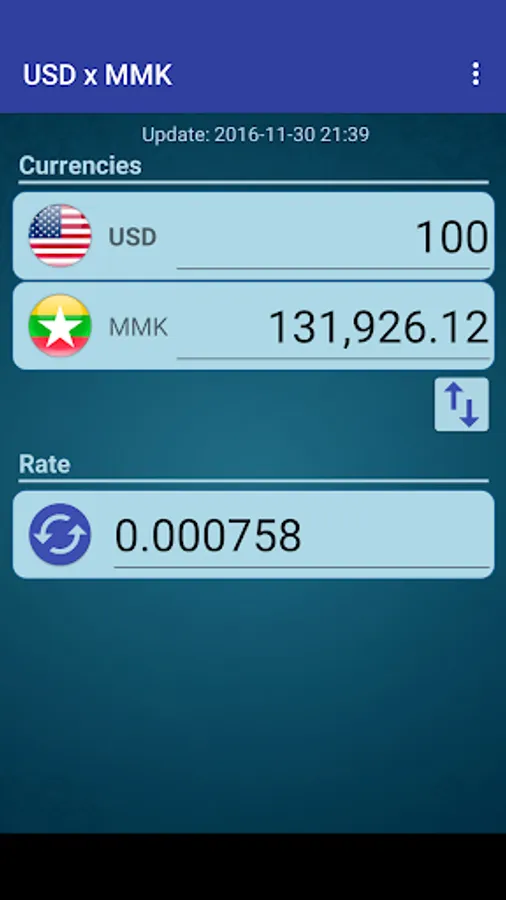A simple currency converter from United States Dollar to Myanmar Kyat and from Myanmar Kyat to United States Dollar.