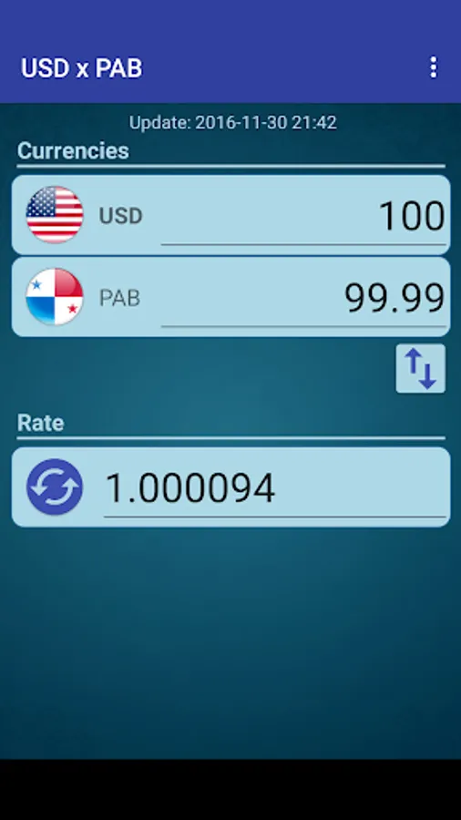 A simple currency converter from United States Dollar to Panamanian Balboa and from Panamanian Balboa to United States Dollar.