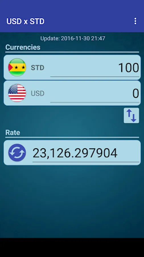 A simple currency converter from United States Dollar to Sao Tomean Dobra and from Sao Tomean Dobra to United States Dollar.