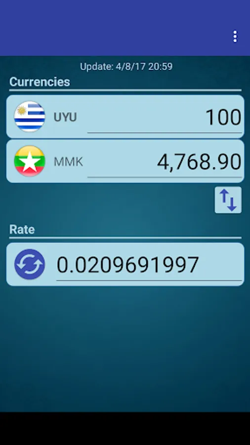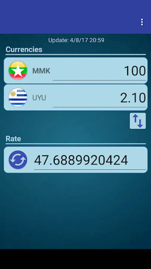 A simple currency converter from Uruguayan Peso to Myanmar Kyat and from Myanmar Kyat to Uruguayan Peso.