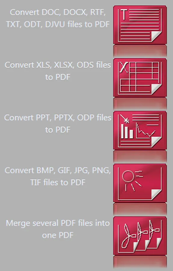 Convert online and for free your files such as documents (DOC, DOCX, RTF, TXT, ODT, DJVU), tables (XLS, XLSX, ODS), presentations (PPT, PPTX, ODP), images (BMP, GIF, JPG, PNG, TIF) to PDF, merge several PDF files into one and view on your mobile device. The app doesn't use the battery and device's resources for conversion, but uses your Internet connection to upload files to our servers where they are converted and returned back. Files are immediately deleted from our servers, when conversion is done.