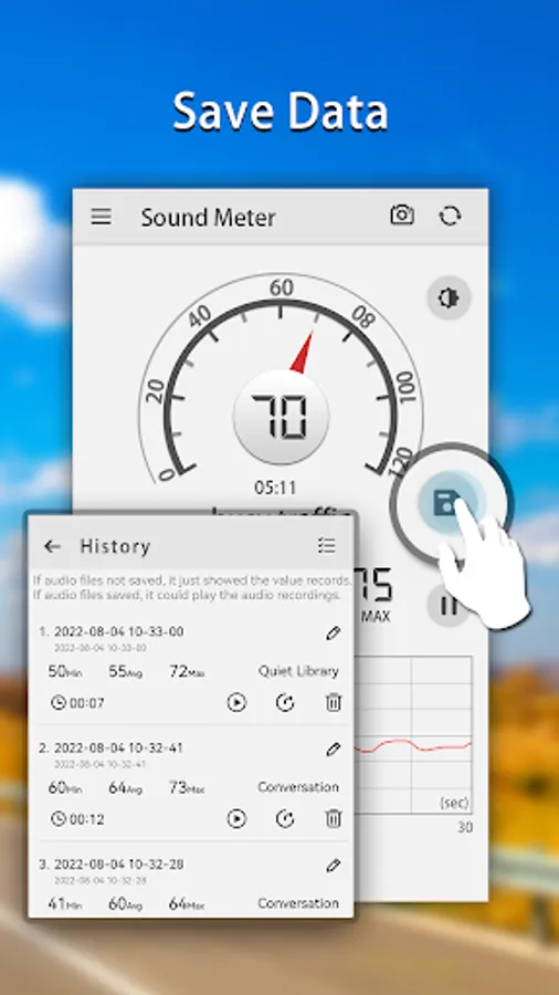 3.To avoid unnecessary loss, please SAVE your recording before exiting the sound meter app
