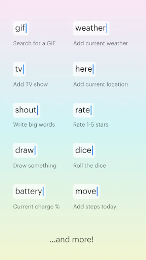 * Other magic words: gif, here, mood, caption, goodmorning, goodnight, battery, weather, move, meetings, dice, time, date, movie, tv, and game. With more on the way.