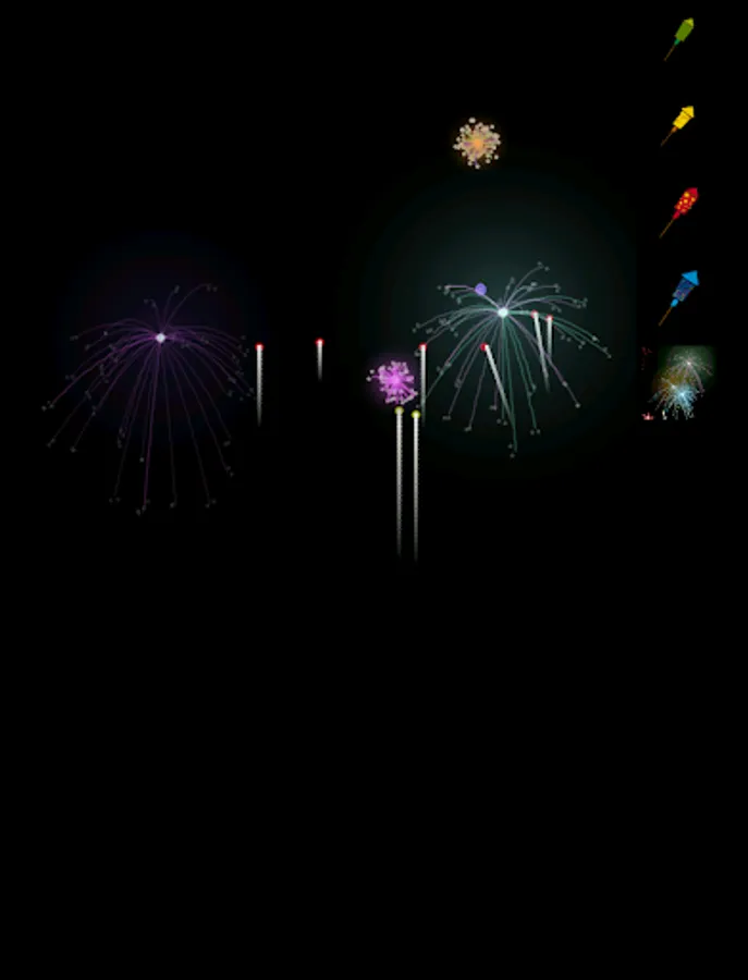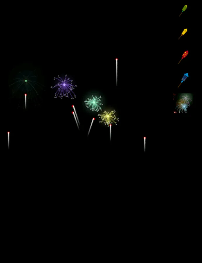 An awesome fireworks simulator. At the click of a button or touch of the screen, you can launch a multitude of fireworks. Each button sets off a different firework, or the display button launches an array of assorted fireworks.