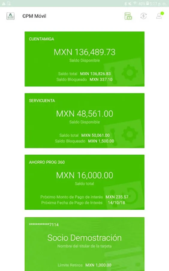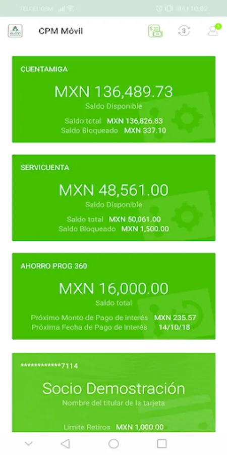 You will be able to check the balances and movements of your accounts, make transfers between your own accounts and to accounts of other members of Caja Popular Mexicana, including the payment of loans, activate, block or unblock your debit card, locate our more than 280 ATMs and our more than 470 branches.