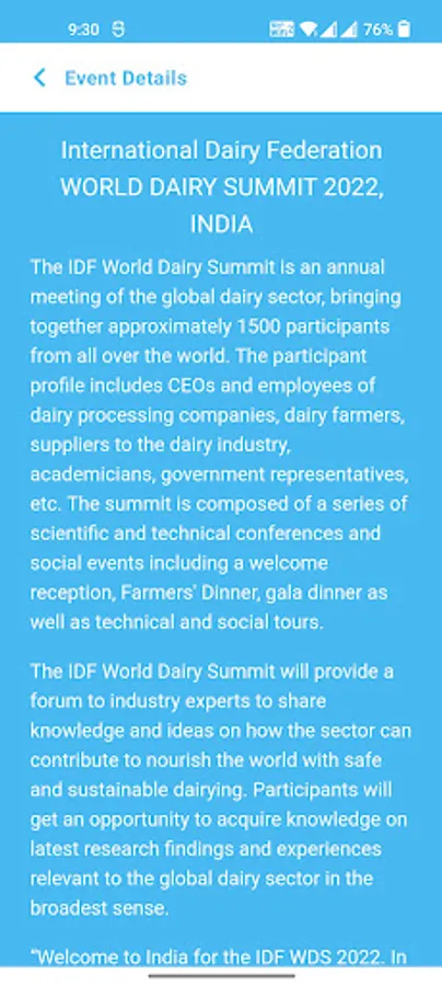 The IDF World Dairy Summit is an annual meeting of the global dairy sector, bringing together approximately 1500 participants from all over the world. The participant profile includes CEOs and employees of dairy processing companies, dairy farmers, suppliers to the dairy industry, academicians, government representatives, etc. The summit is composed of a series of scientific and technical conferences and social events including a welcome reception, Farmers' Dinner, gala dinner as well as technical and social tours.