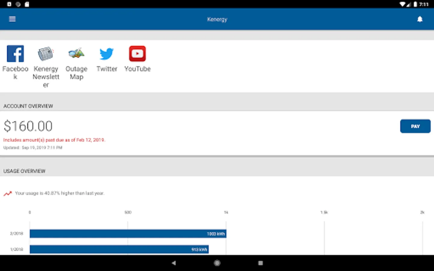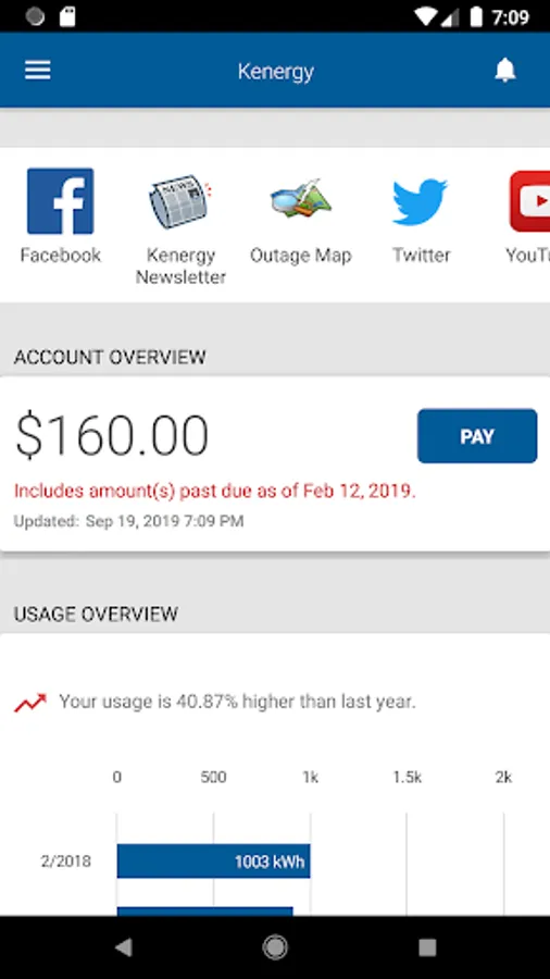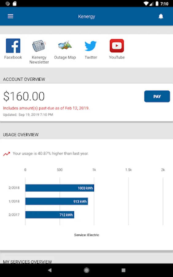 The Kenergy app provides customers account management at their fingertips. Customers can view their usage and billing, manage payments, notify customer service of account and service issues and receive special messaging from Kenergy.