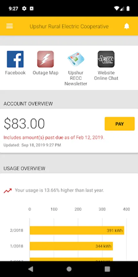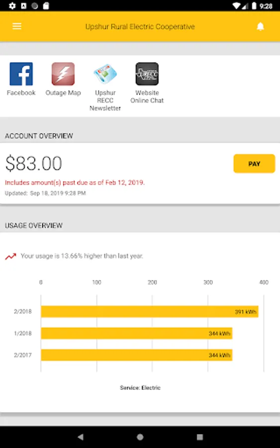 Upshur Rural provides URECC customers account management at their fingertips. Customers can view their usage and billing, manage payments, notify customer service of account and service issues and receive special messaging from URECC.