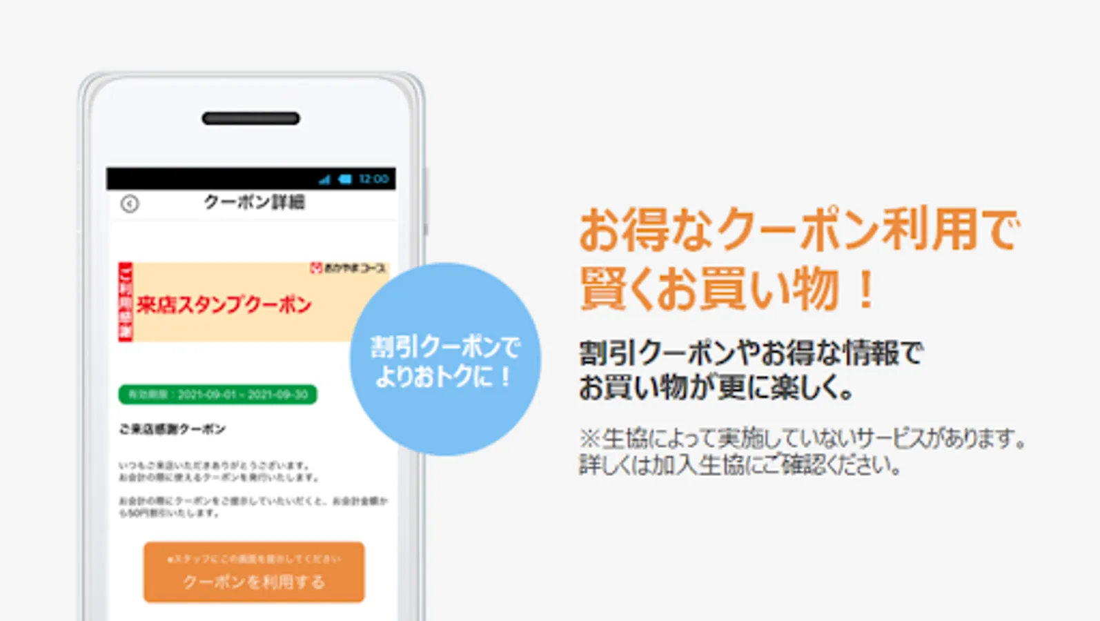 The co-op app can be used by members of the Tottori Prefectural Co-op, Co-op Shimane, Okayama Co-op, Co-op Hiroshima, Co-op Yamaguchi, Tokushima Co-op, Co-op Kawa, Co-op Ehime, and Kochi Co-op.