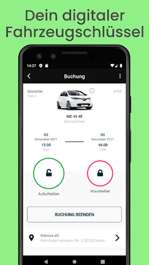 With the Vianova eSharing app, reserve an available car, cargo bike or pedelec at a respective station for the desired time, open it, close it and park it there again at the end of your journey.