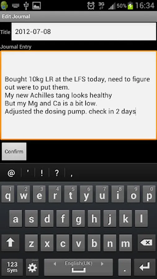 The PRO version includes a Simple but easy to use Journal that gives you freedom to include whatever you would like, (Parameter values, Fish purchases, future Coral purchases, daily aquarium observations. Only your imagination sets the limit!)