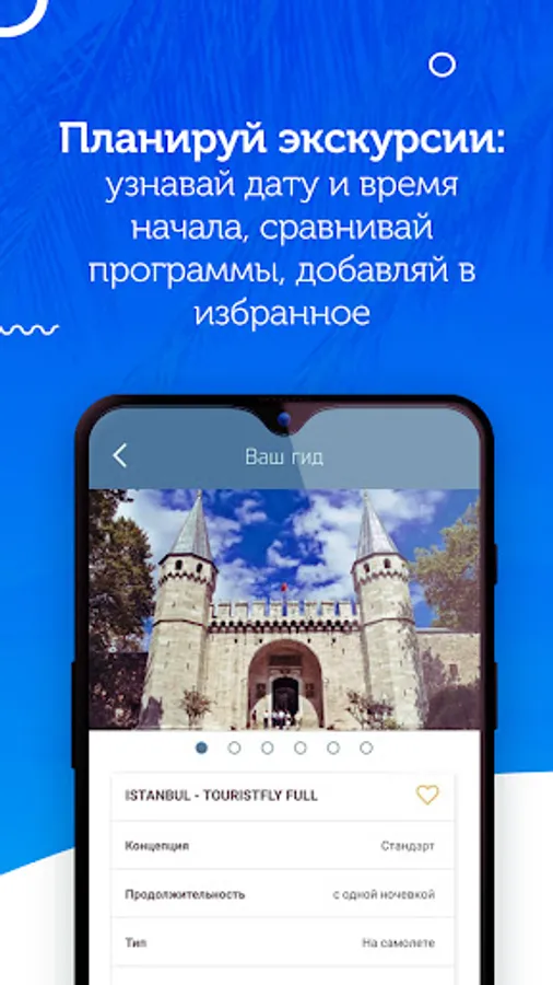 • Excursions. Explore the available excursions in the country of your vacation, find out the program and possible dates of the trip and add the excursions to the "Favorites".