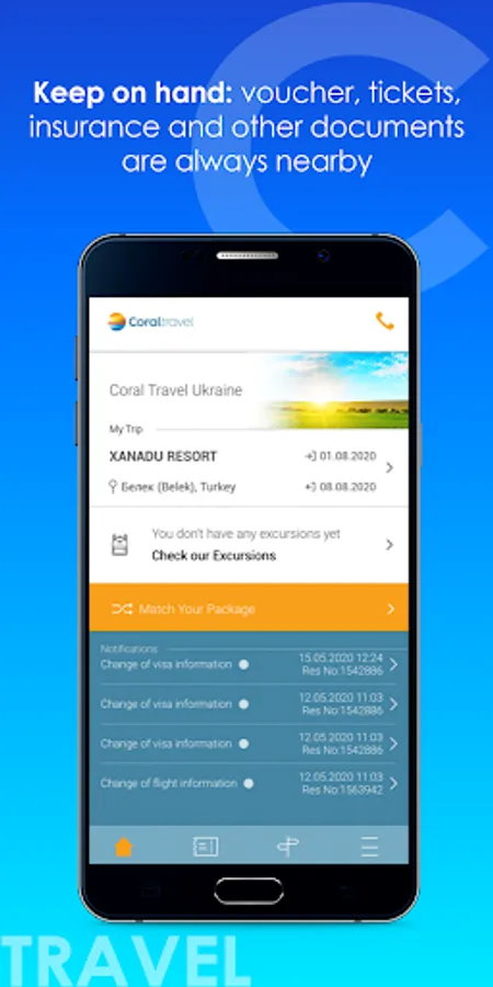 If you travel with Coral Travel, this app is for you! Here you will find all the documents for the trip, you can track the status of your reservation, flight schedules and time of transfers, learn all about excursions in the country of rest. With the help of a mobile assistant, preparing for a vacation will be quick and easy, and the rest itself will be even more vivid!