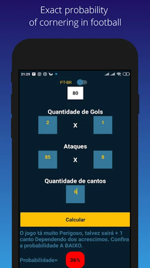 My developers have studied for a long time the probability of hits in corners in football and from that they created me, which is a logic that shows in a simple and effective way the chance to come out of corners. My main aim is to give you almost exact values.