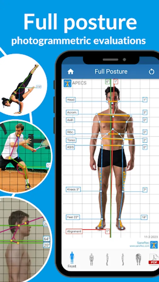 Designed for professional use, the app is a unique tool to quickly evaluate the anthropometric characteristics of posture, to check the state of the back, head, neck, legs and feet.