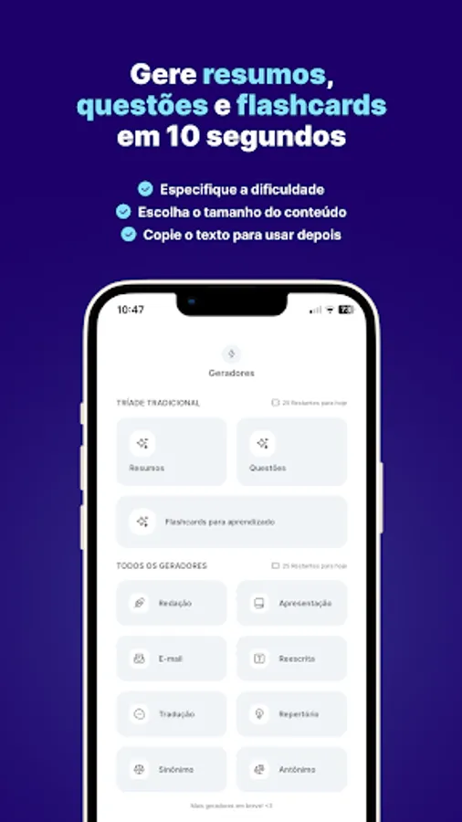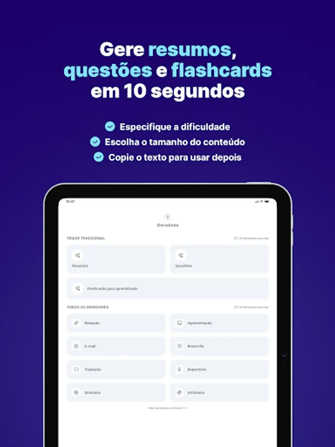 - Fast content generation: In less than 10 seconds, get summaries, flashcards and questions about any content. Customize the accuracy of generated materials by choosing between ease and size levels.