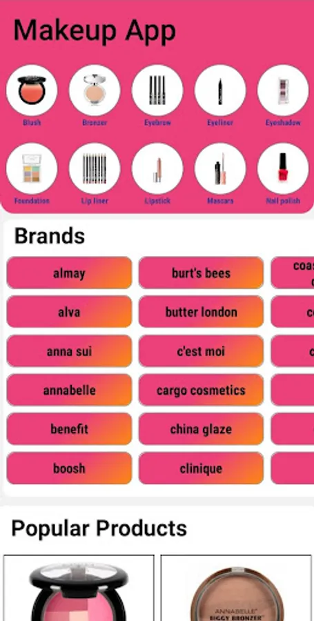 In the landing page you can see 10 different makeup types, 50+ brands and recently most popular products.