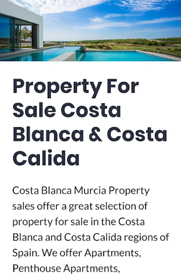 Costa Blanca Murcia Property offer a large choice of apartments, townhouses, villas, building plots, fincas, golf properties and new build developments in the Costa Blanca and Costa Calida Murcia regions of Spain.