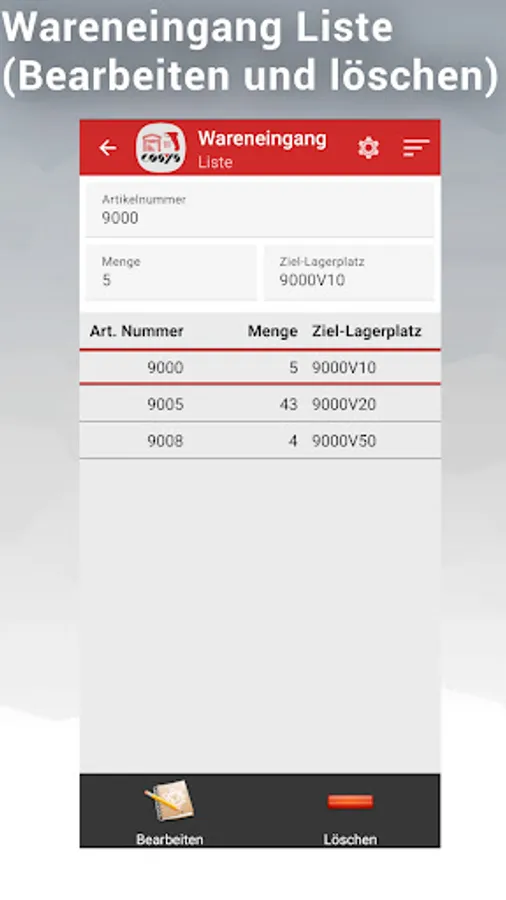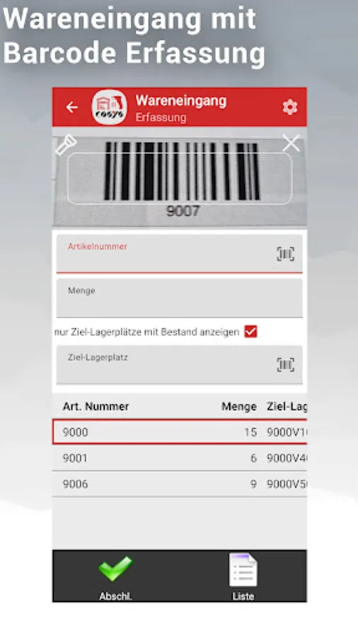 When storing items in a storage compartment, the item number is recorded using the barcode scanner plug-in. The quantity to be stored can either be entered manually using the keyboard or added up by scanning the article number. To complete, only the destination bin number needs to be scanned and the captured data sent.