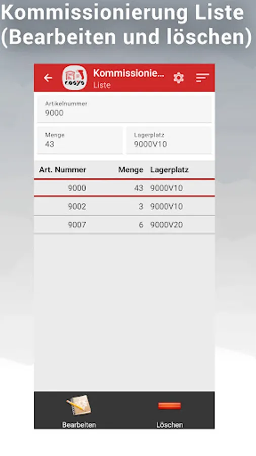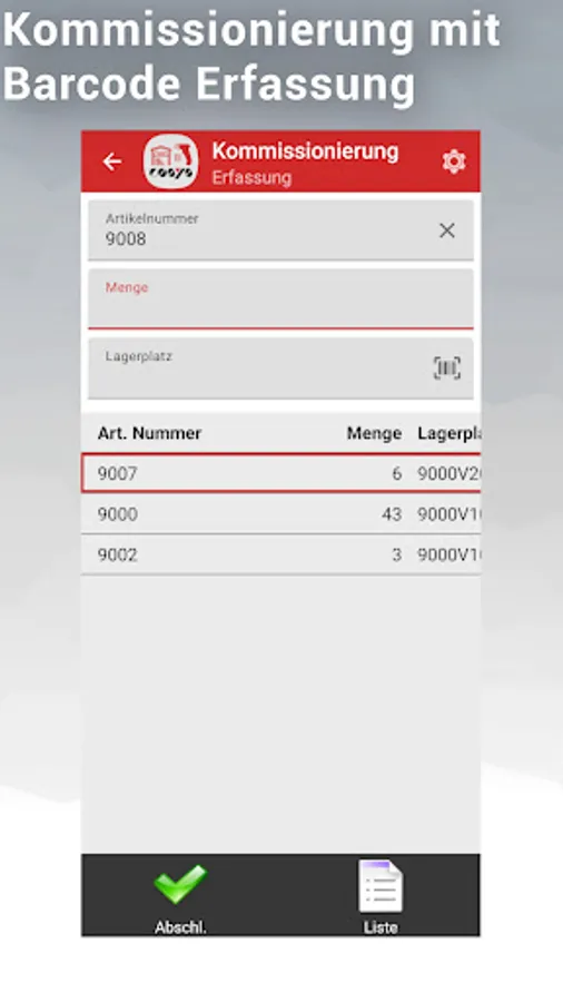 Retrieval takes place in the same way as storage. The item number of removed items is recorded by a barcode scan. The removal quantity can also be specified here by adding up the scan or by entering it manually. Finally, the storage location number is recorded and the order can be completed.