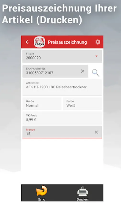 • Price change: To change the price - up or down - scan the item number or EAN, enter the new retail price and the number of items affected. In the full version you can send the data directly to a printer.