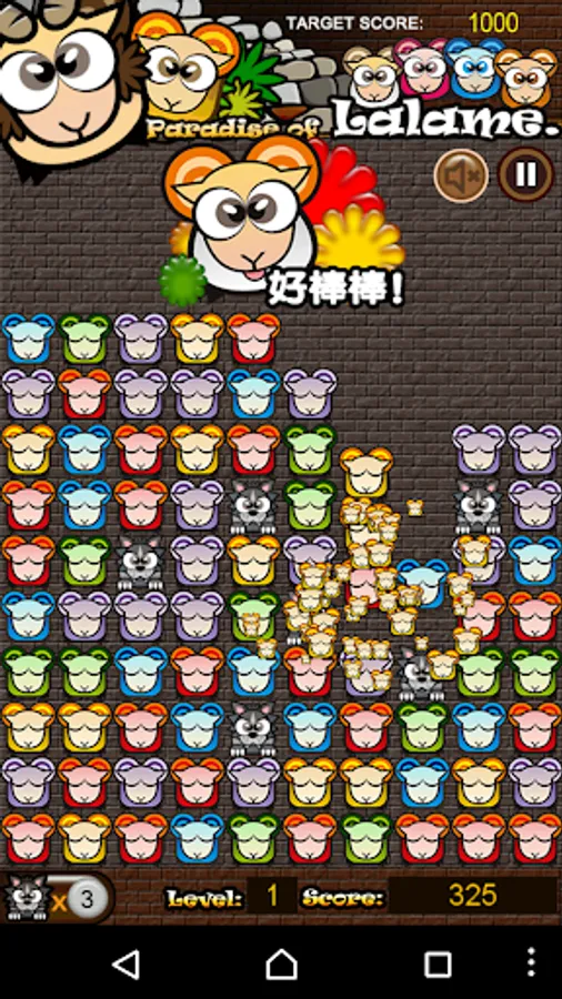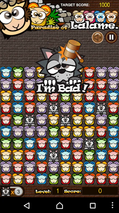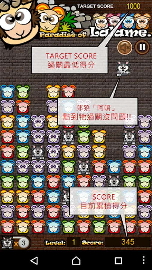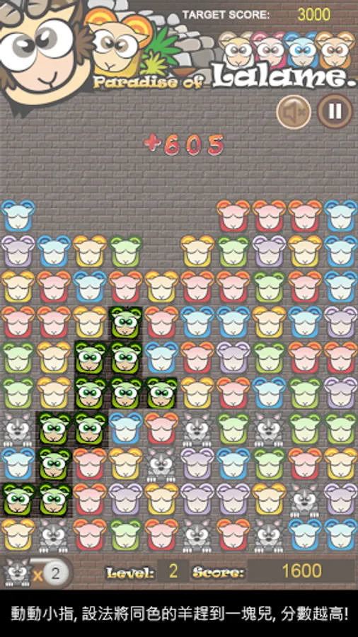 故事背景設定在還沒分出族派的Lalame羊群,關在牧場中的Lalame長相都差不多,此時的您必需扮演挪亞的角色,按著小羊身上的色彩,設法湊成一群"點"醒牠們,從螢幕的小畫框中拯救出來。在羊群的郊狼「阿嗚」,雖然他們真的是來亂的,但您只要利用狼主的功能消去它們,或眼明手快抓到畫面上快速奔跑的「阿嗚」,牠們反而會是協助您過關的好幫手呢!