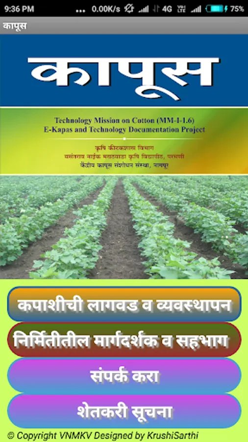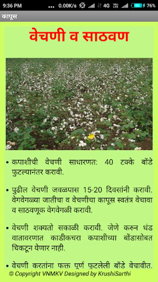 This app provides an authentic source for cotton cultivation for Marathwada( Maharashtra) and useful information on package of practices of Cotton such as pest and disease management, fertilizer management, irrigation, critical growth stages etc.