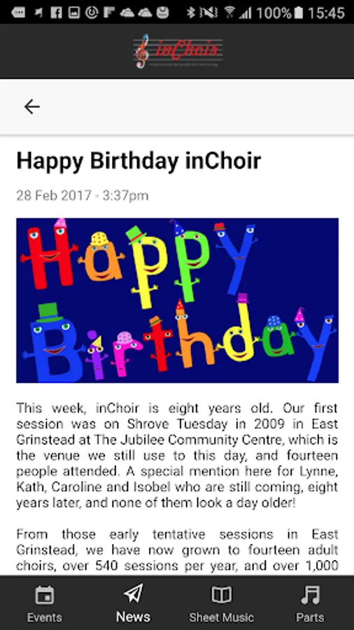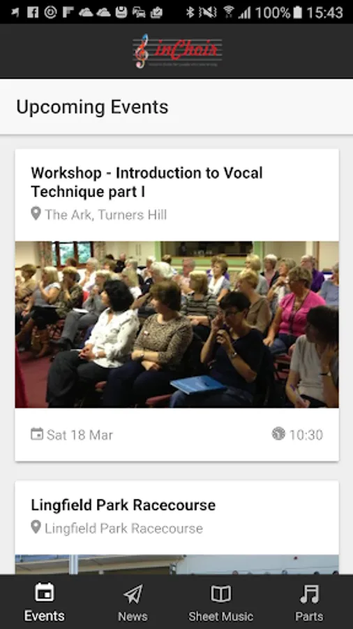 App for members of Kent, Surrey, and Sussex based singing group inChoir, enabling you to access the sheet music, listen to recordings of vocal parts, and to keep up-to-date with the latest news & events.