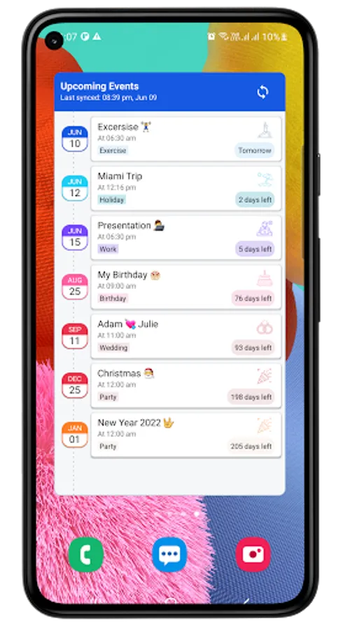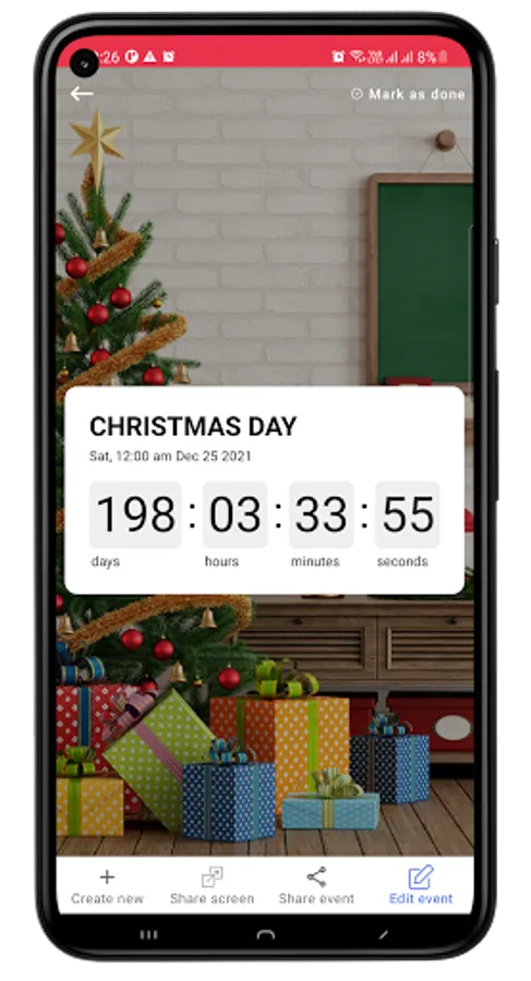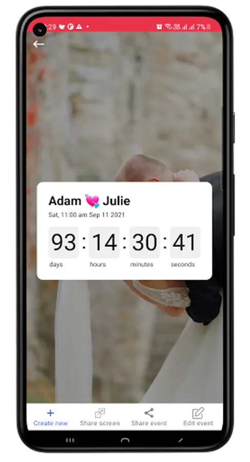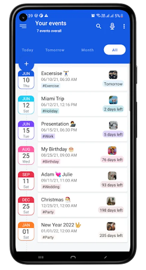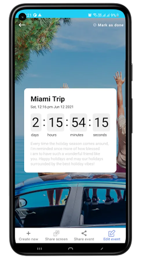 App will list down all your upcoming events with full screen countdown timer for each event.