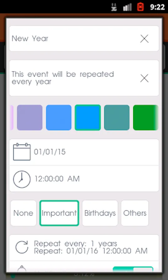 • sorting the events by groups (birthdays, documents, important events, etc.)