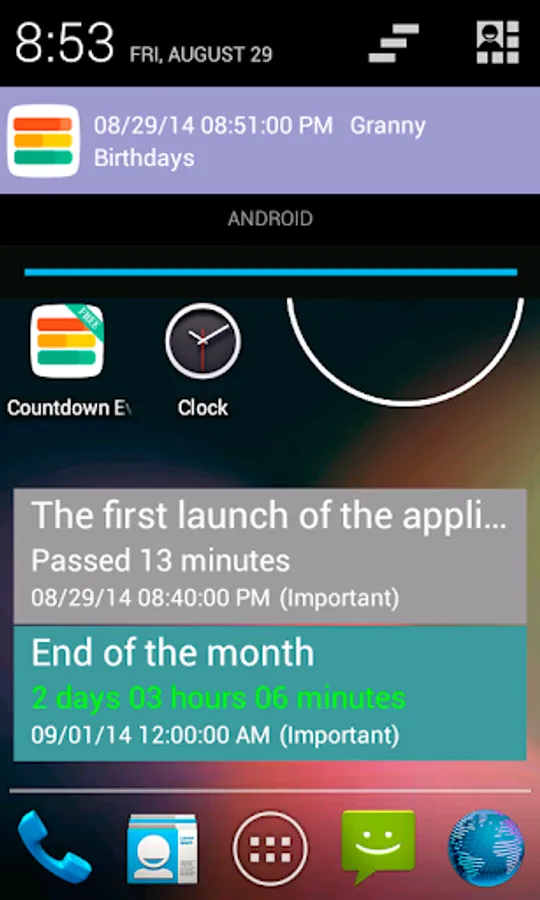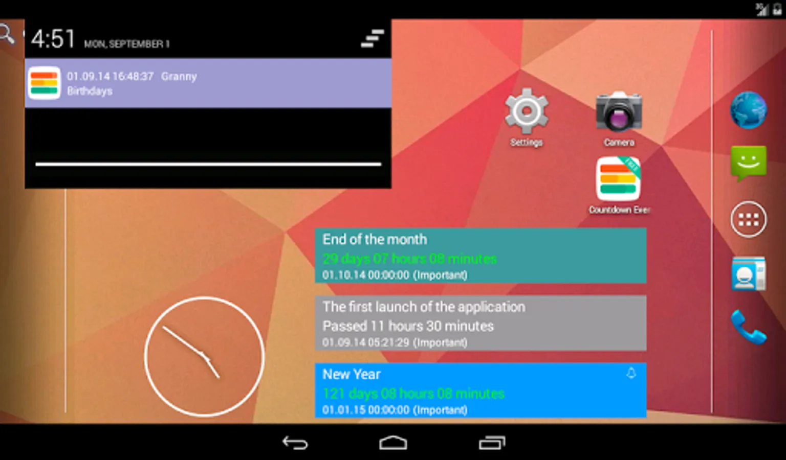There are also two types of widgets in the application. The first shows two closest to the coming events. The second widget can be added multiple times with different selected calendar events in it. Widgets will help you to be always aware of the time remaining to the date of the event, without going into the app. System call to the widget is made only once a minute, saving the battery of your device.