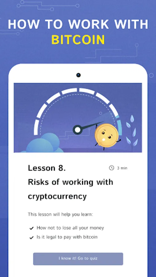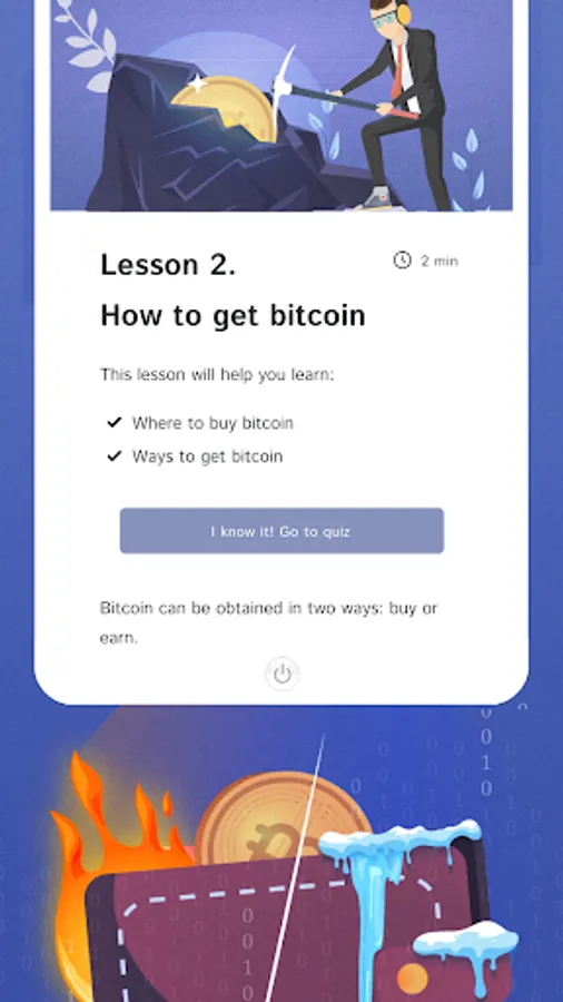 What are the ways to get cryptocurrency and where to store it is a very important question. In our crypto app, a separate lesson exists for learning these issues. We explain in detail how you can get bitcoin or another cryptocurrency, as well as where to store it. After learning the information in the lesson, you will need to pass a test by answering the questions that refer to this block. There are tests in our application after each lesson passed. In this way, it is impossible not to remember the learnt information