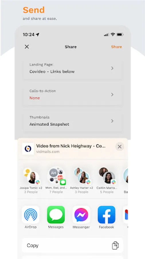 - Share your video via email, SMS, or other apps on your phone including Facebook, Twitter, LinkedIn, Viber, WhatsApp, Slack, and many others