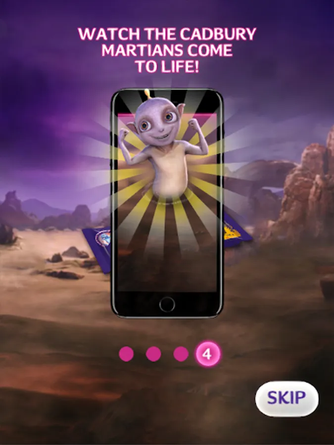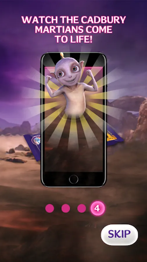 Get any of the new Cadbury Dairy Milk limited-edition slabs - P.S., Astros, 5Star or Crunchie - and use the Cadbury Martians app to summon one of the Martians on your phone through the magic of augmented reality. Simply view any of the limited-edition slabs through the app camera for #JoyOfANewKind. Try two or four slabs for extra special Martians interactions. Cupido, Cosmo, Luna and Buzz are so excited about the new delicious Cadbury Dairy Milk chocolate flavours that they've discovered on Mars, and they can't wait to share them with you!