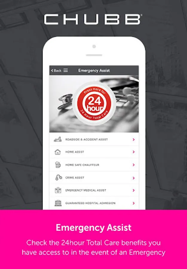 Your phone is the fastest way to help in any emergency. The Chubb Cares App solution is the latest development in Value Added Insurance Technology and gives users direct access to their policy benefits and 24-hour assistance with a simple touch of a button. Our App suite is custom-built to suit the needs of Emergency Assistance services, reducing the time required to assist clients. All client apps come with free Family Assist benefits that ensure you are protected and get the most out of your policy.