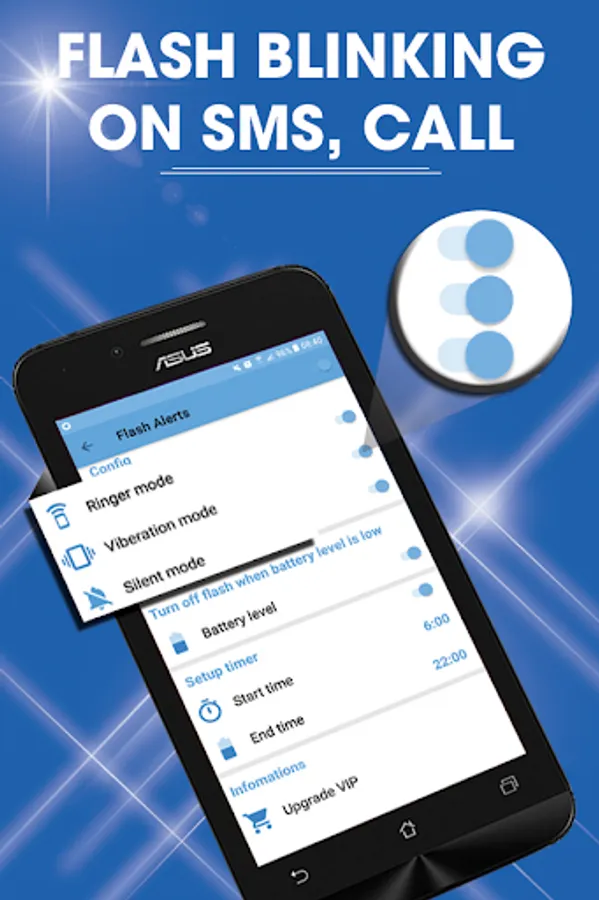 This Flash on call and SMS will notify you via mobile phone’s back light flash alerts , the back side flashlight will blink giving incoming call alerts and sms alerts. LED call blinking and sms blink LED indicator. See the blinking flashlight alert notifications when phone rings with an incoming call or incoming text message.