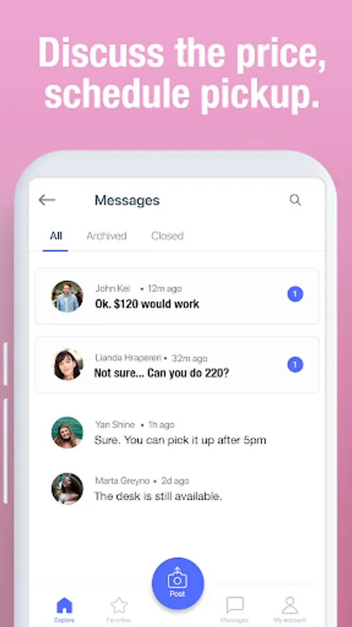 Instant messages through the app let you agree on the price fast, discuss a meeting place and delivery options. After that, you are all set! No middleman, no extra fees (no fees at all), no hassle.