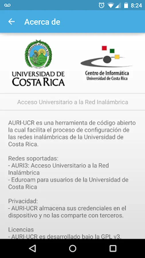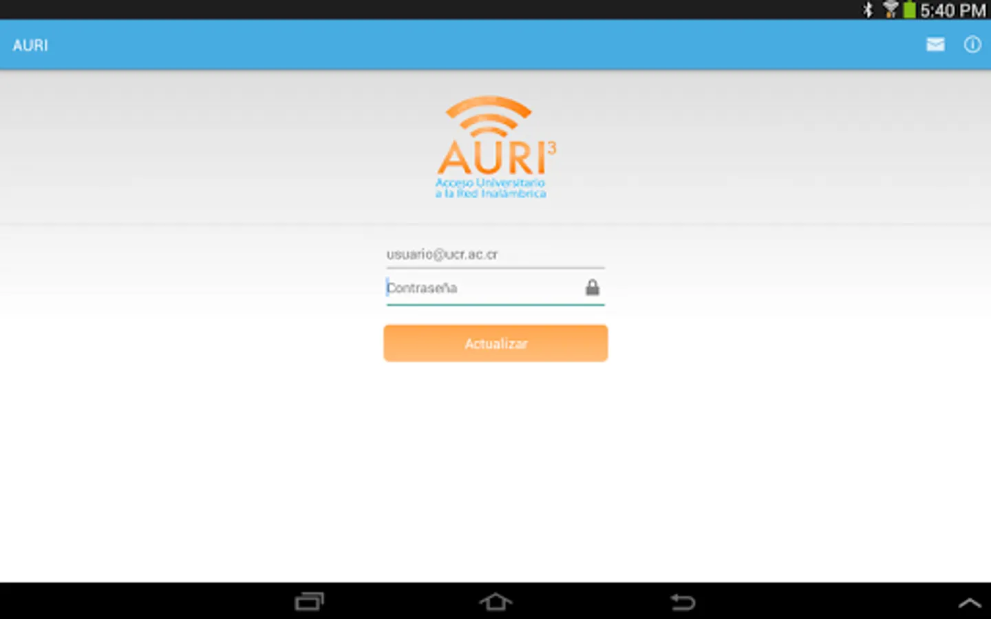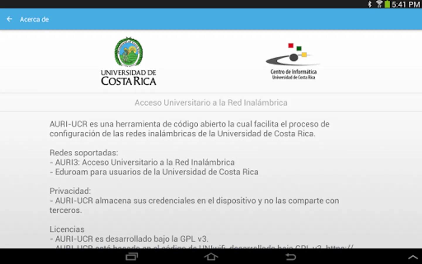 The AURI-UCR application is designed for administrative users and students of the University of Costa Rica (UCR), in order to assist them in shaping their credentials to access Internet through AURI and eduroam wireless networks.