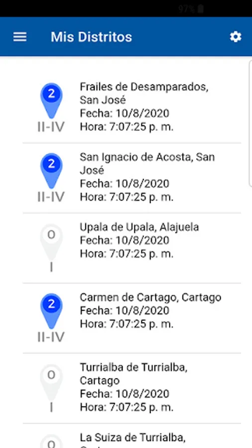 The APP has a section called "My districts" where the user selects the sites where they would be interested in receiving information on the seismic intensity once the earthquake has concluded. In this way, a user can select the district where their home or that of their family is located and another where their workplace is located. The APP would indicate the approximate value of seismic intensity that occurred in each place.