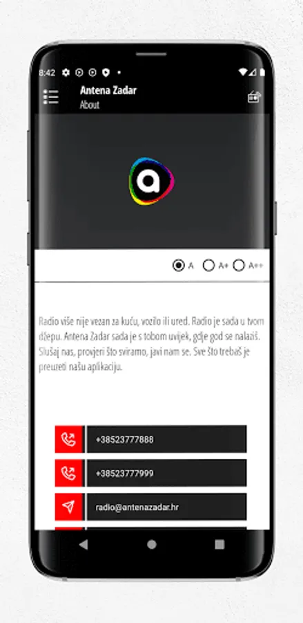 Radio više nije vezan za kuću, vozilo ili ured. Radio je sada u tvom džepu. Antena Zadar sada je s tobom uvijek, gdje god se nalaziš. Slušaj nas, provjeri što sviramo, javi nam se. Sve što trebaš je preuzeti našu aplikaciju.