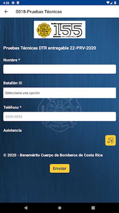The application is a form viewer that allows the field survey of operational data of the Costa Rican Fire Department task forces in real time, these forms are created from a web generator and the collected information is stored in a way centralized