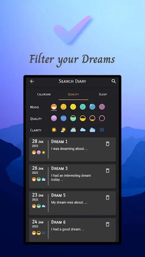 🌒 Search & filter functions: Filter and search your dreambook based on texts, tags, mood, clarity, sleep quality, or Calendar.