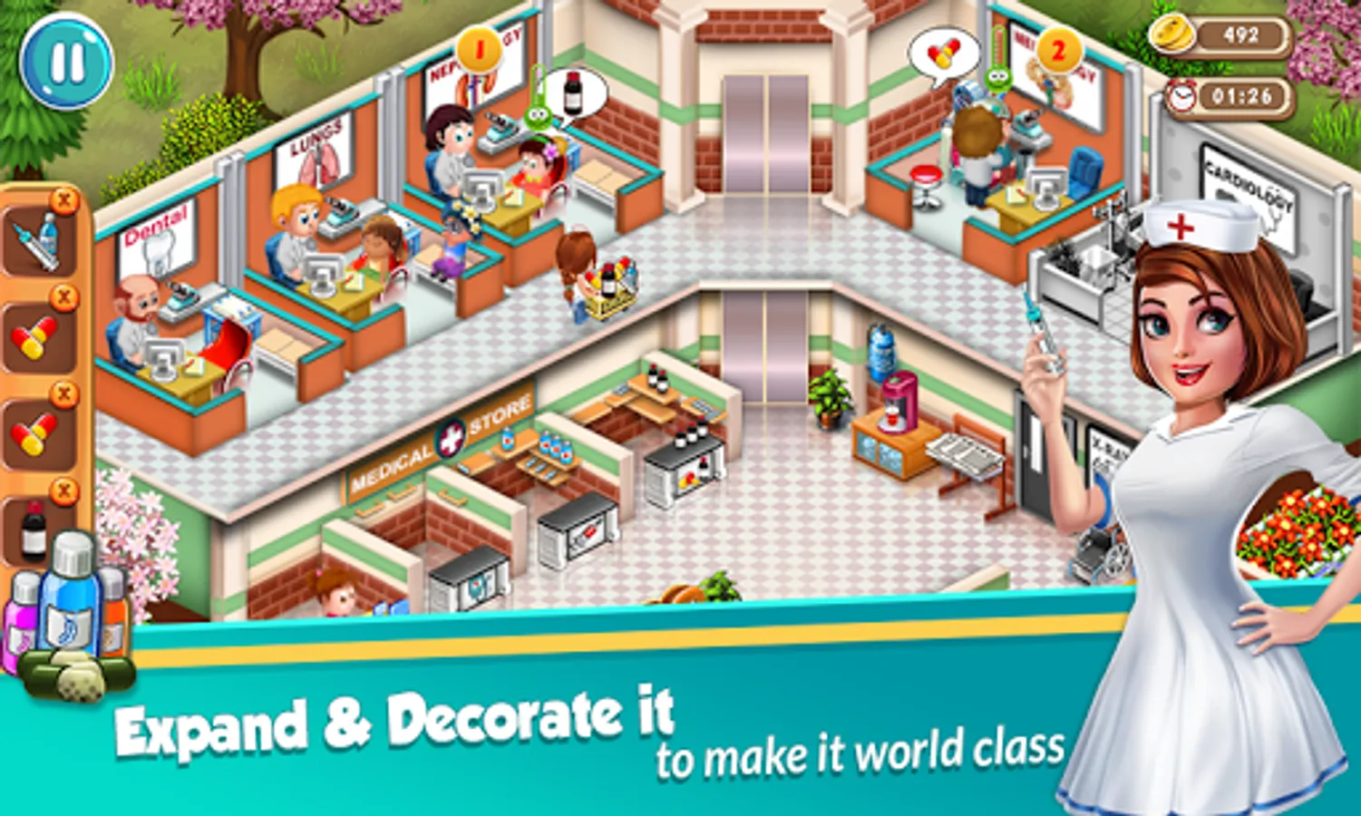 In this time management game patients will keep coming so here is the good news you have a nurse to assist you in this Doctor Dash Hospital Game and she is the one who will help them back to health! Manage your time with your busy nurse and work fast to diagnose, treat and cure all those in need of your skills. In this Doctor Dash Hospital Game you will get a wheel chair also to serve critical patients and reception desk to help you best. Be prepared for emergency situations where you have little time to save lives! Make crucial decisions; combine the best medicine and all kinds of other medical procedures on your patients. In this multilevel Doctor Dash Hospital Game you can unlock various features in this doctor game at various levels. Design, expand and build it to make it bigger, upgrade and decorate it to make it prettier, staff and manage it to make it the best hospital ever.