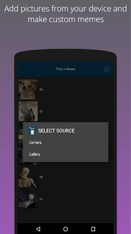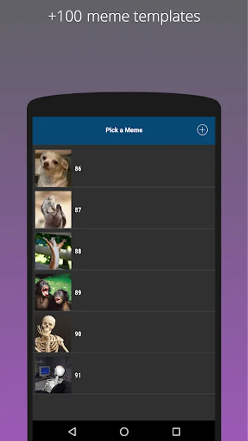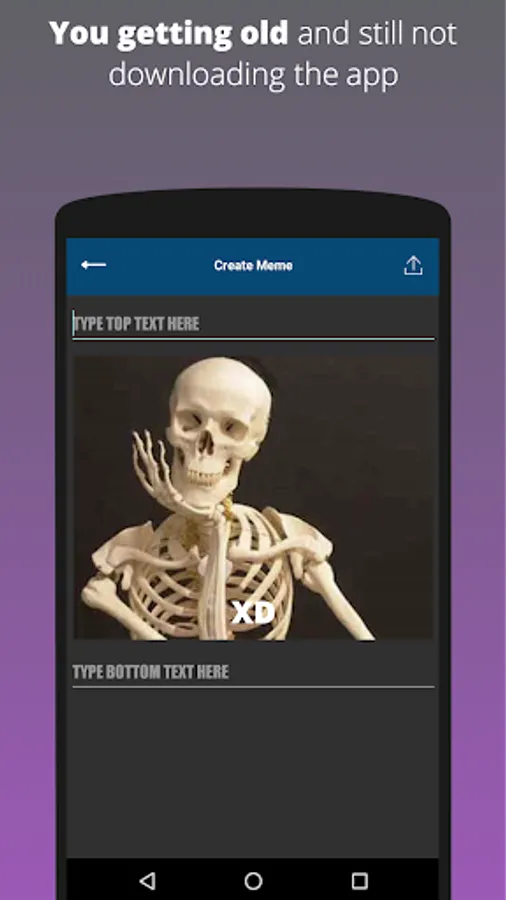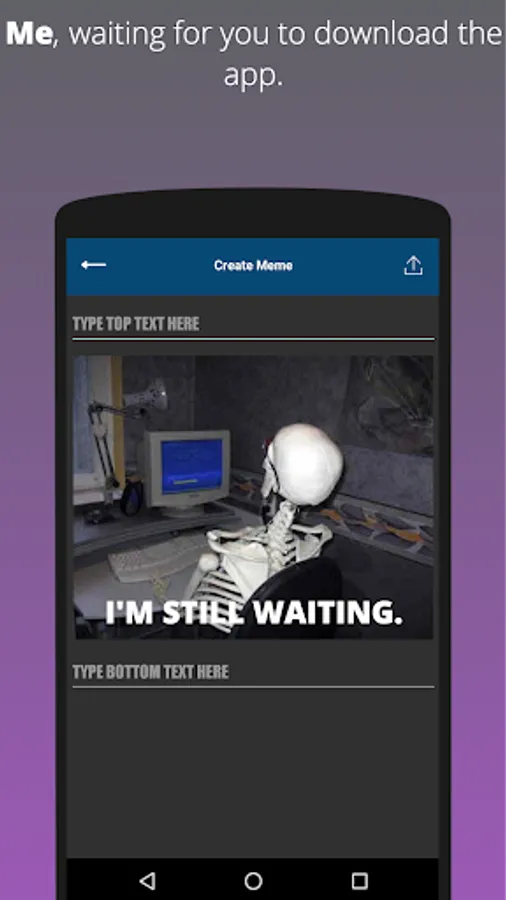 Let everyone know how funny you are! Enter our simple meme creator, select a template or add a photo from your gallery, add text and share it, it's that simple. Do you have what it takes to create the next viral meme?