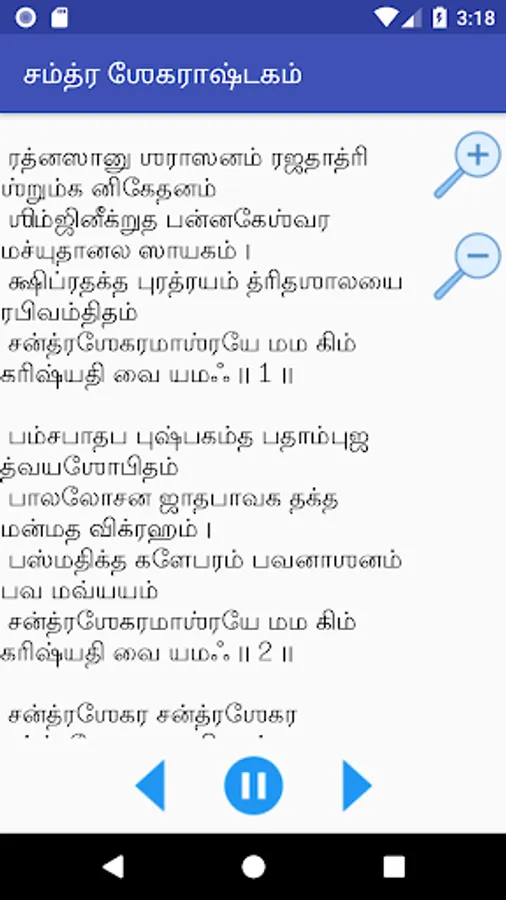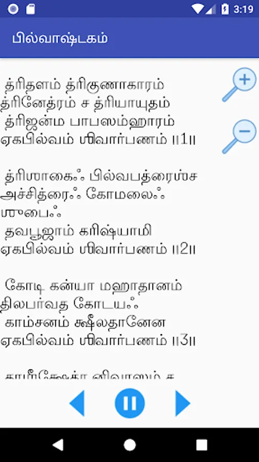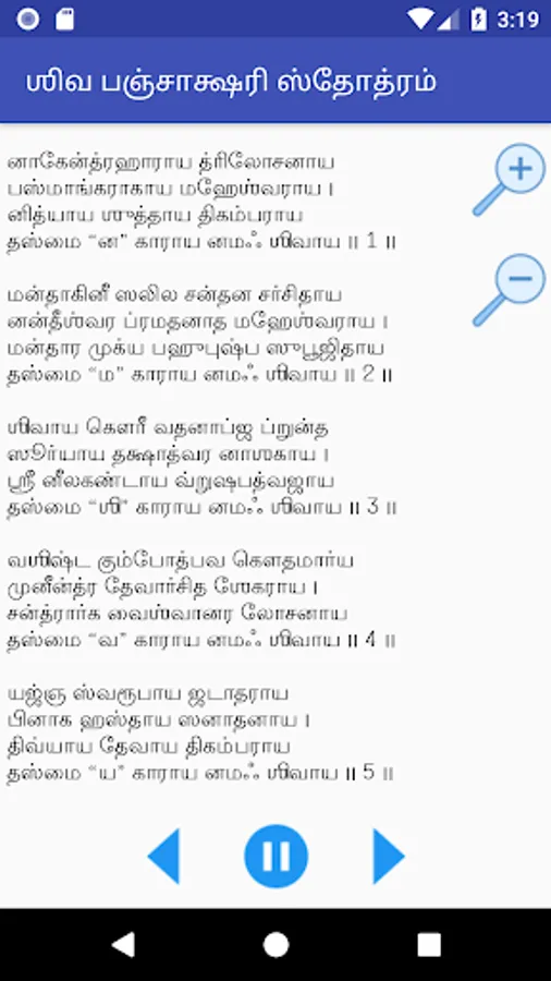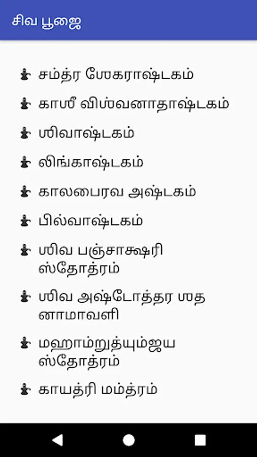 This application contains musical mantras with lyrics in Tamil for Lord Siva puja. With this application, it is easy to learn the pronunciation of mantras as one can read the lyrics while listening to mantras. Below are the contents:
