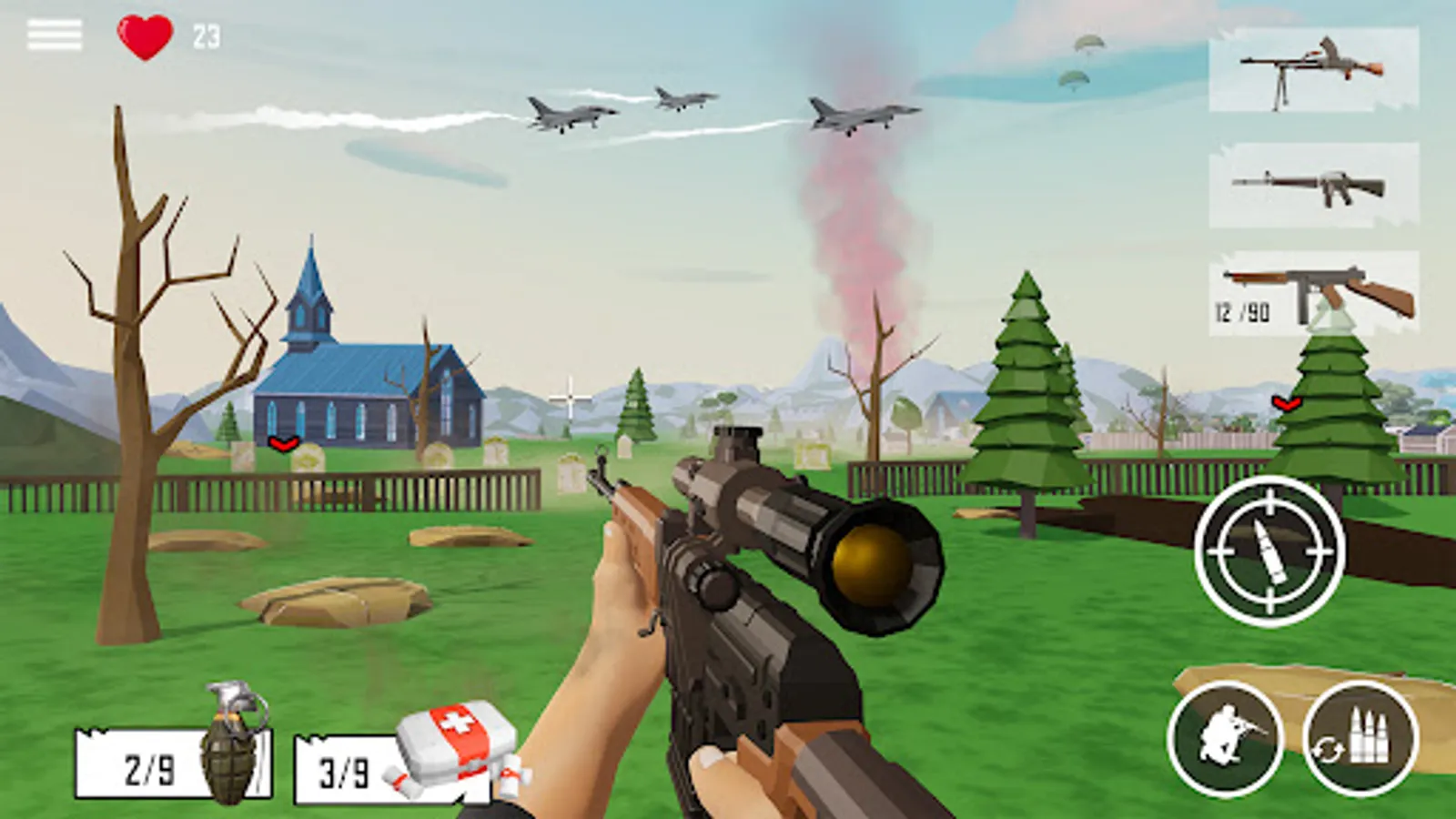 Have tons of fun with free shooting games in real world war scenarios. Shoot enemy soldiers, kill zombies or choose gun fighting against other players in WW2 Heroes: Polygon World War Games without internet. Shoot war dogs in air combat by shooting AA guns. You can use war machine guns to protect your position against waves of enemy troopers. Snipe and destroying tanks, and much more fun of guns shooting games in ww2 scenarios!
