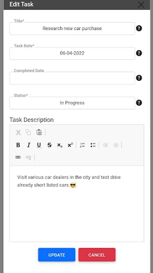 • Details task management, with rich text editing, is also available.