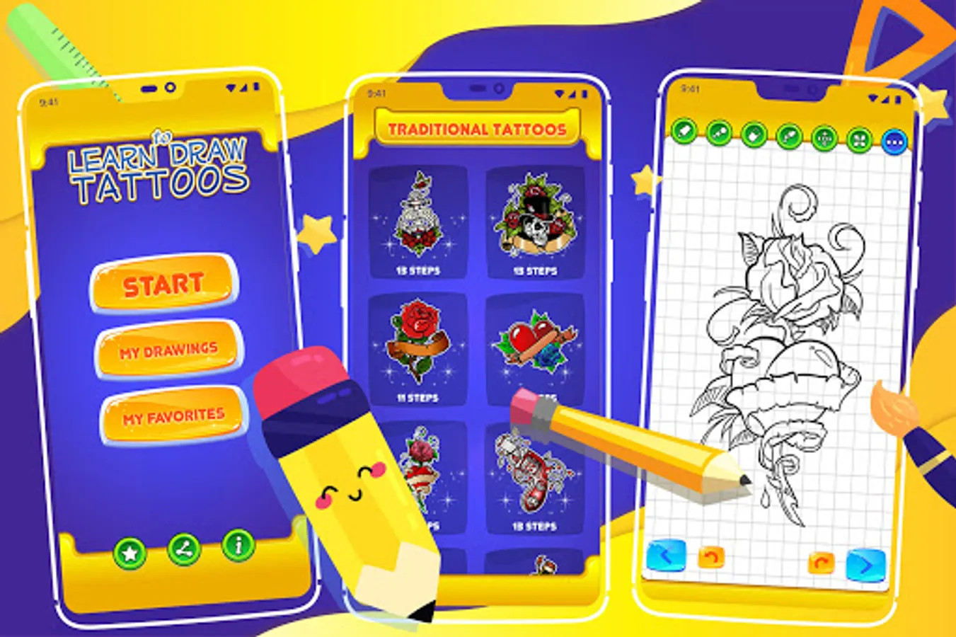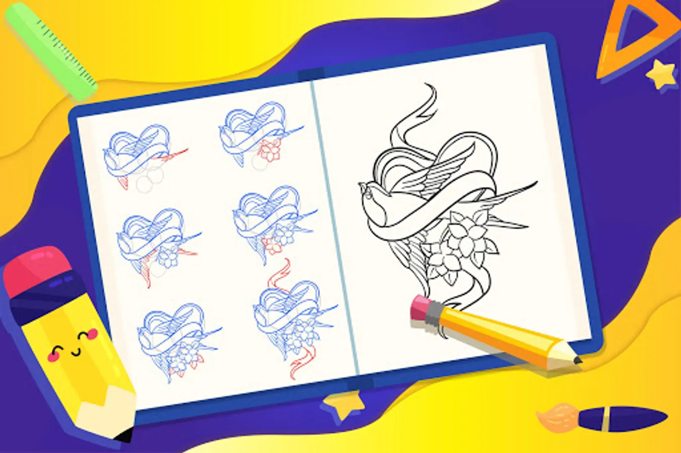 Learn How to Draw Tattoos will increase your drawing skills to higher level with amazing Traditional Tattoo drawings. This Drawing App provides step by step guide to teaches you how to draw Vintage Tattoos and improve your level of being an artist.